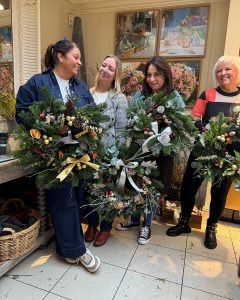 The workshop with tables piled high with winter greenery, berries, ornaments, and more varieties of ribbon than any of us knew existed. After a quick demonstration from our instructor, we dove in, some confidently, others with mild panic as wire and foliage seemed to have minds of their own.